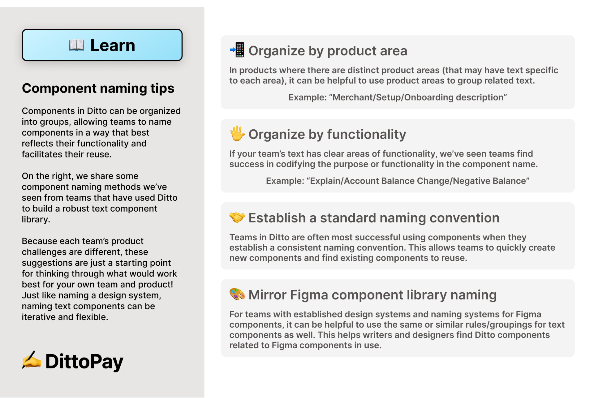 - Designers can reference existing copies by searching the component name and copy values since the naming convention mimics the designers already established design system.