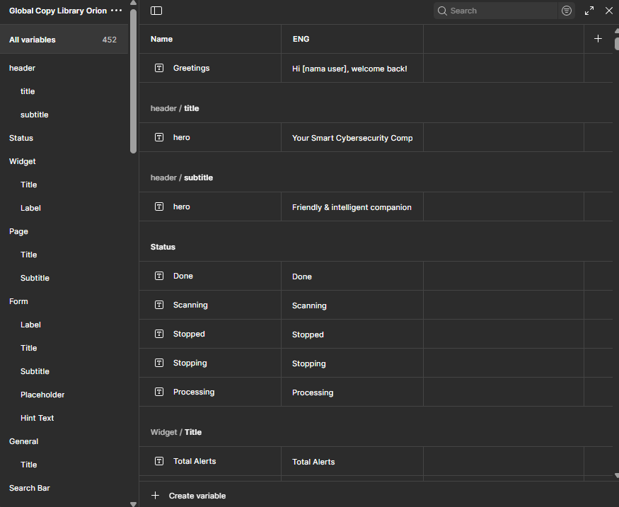 Our team builds a cybersecurity platform to monitor user environments. In the early days, when the product was small, we managed copy fairly well across multiple Figma files, even though it was scattered. But as the product grew, we quickly realised this approach was no longer efficient.