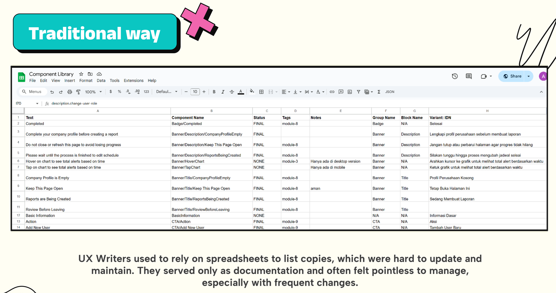 "Updates have to be done manually and spread across multiple files. Noted that without a better system, revising the same phrase in several design frames or JSON files becomes a repetitive hassle, and errors can slip in."