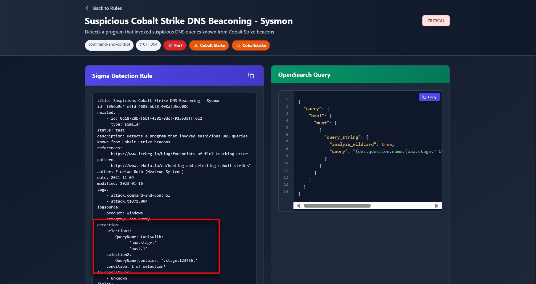 For example, the rule “Suspicious Cobalt Strike DNS Beaconing – Sysmon” detects DNS queries for domains starting with "aaa.stage.", "post.1", or containing ".stage.123456." anywhere in the domain name. On the right-hand panel, you can also view the converted Sigma to OpenSearch query.