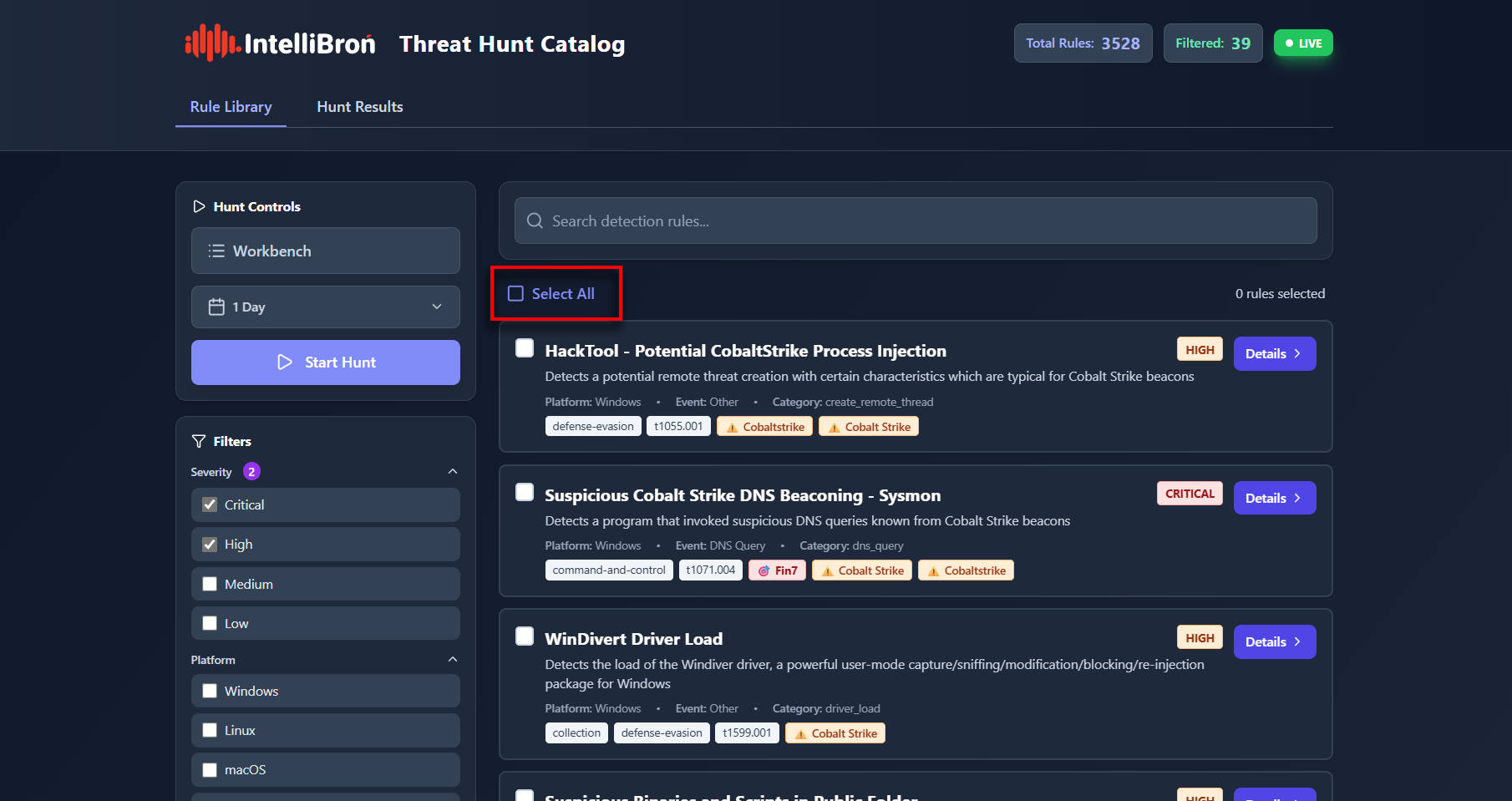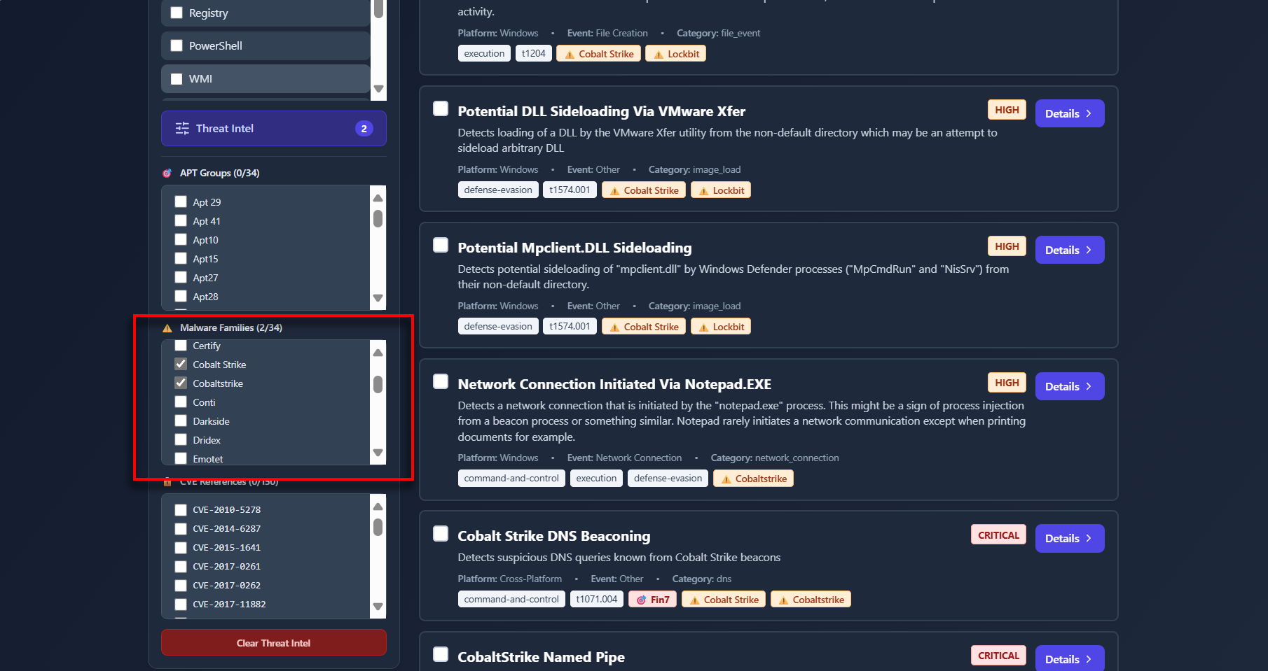 - Find the Rules: Instead of digging through articles, you just have to filters and select "Cobalt Strike".
